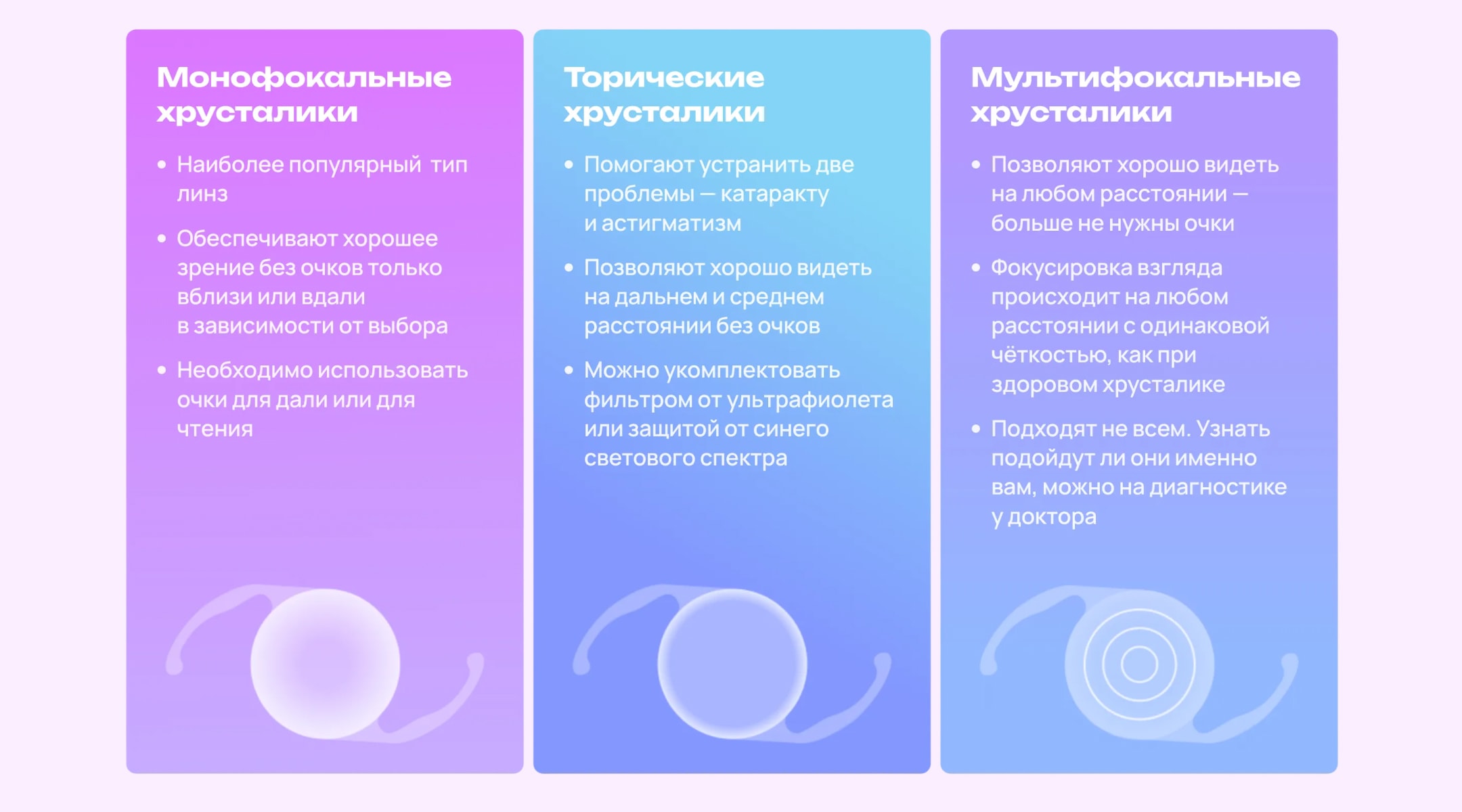Ключевой момент современной операции — подбор интраокулярной линзы (ИОЛ), то есть искусственного хрусталика. Именно он заменит помутневшую природную линзу и станет новой оптической системой вашего глаза, определяя остроту и комфорт зрения. Сегодня существует несколько типов линз, которые решают разные задачи: