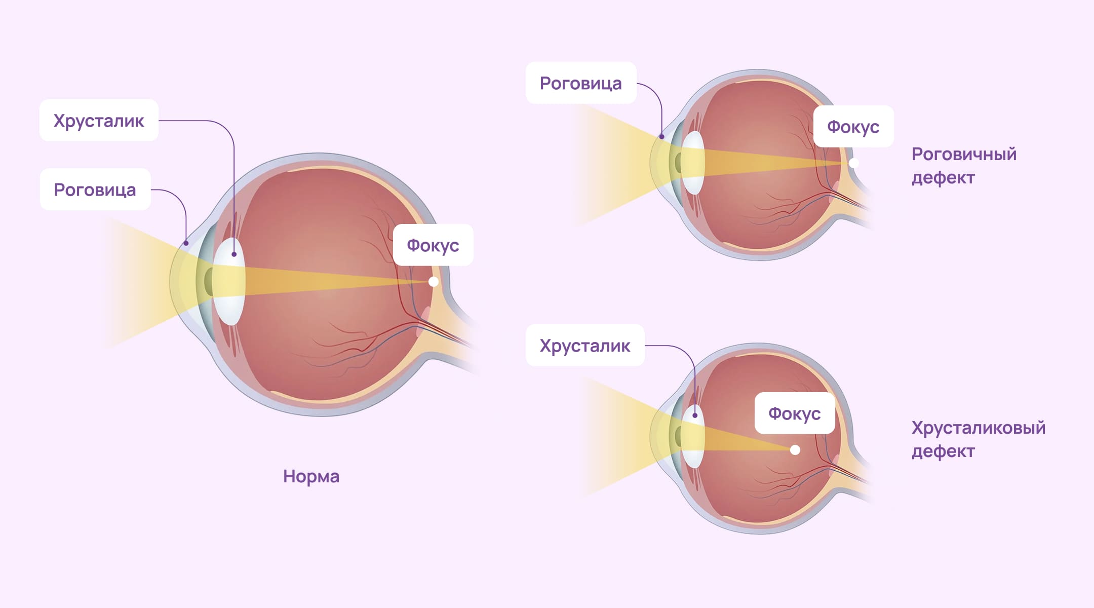 – Хрусталиковый дефект встречается реже и связан с неравномерной кривизной или положением хрусталика внутри глаза.