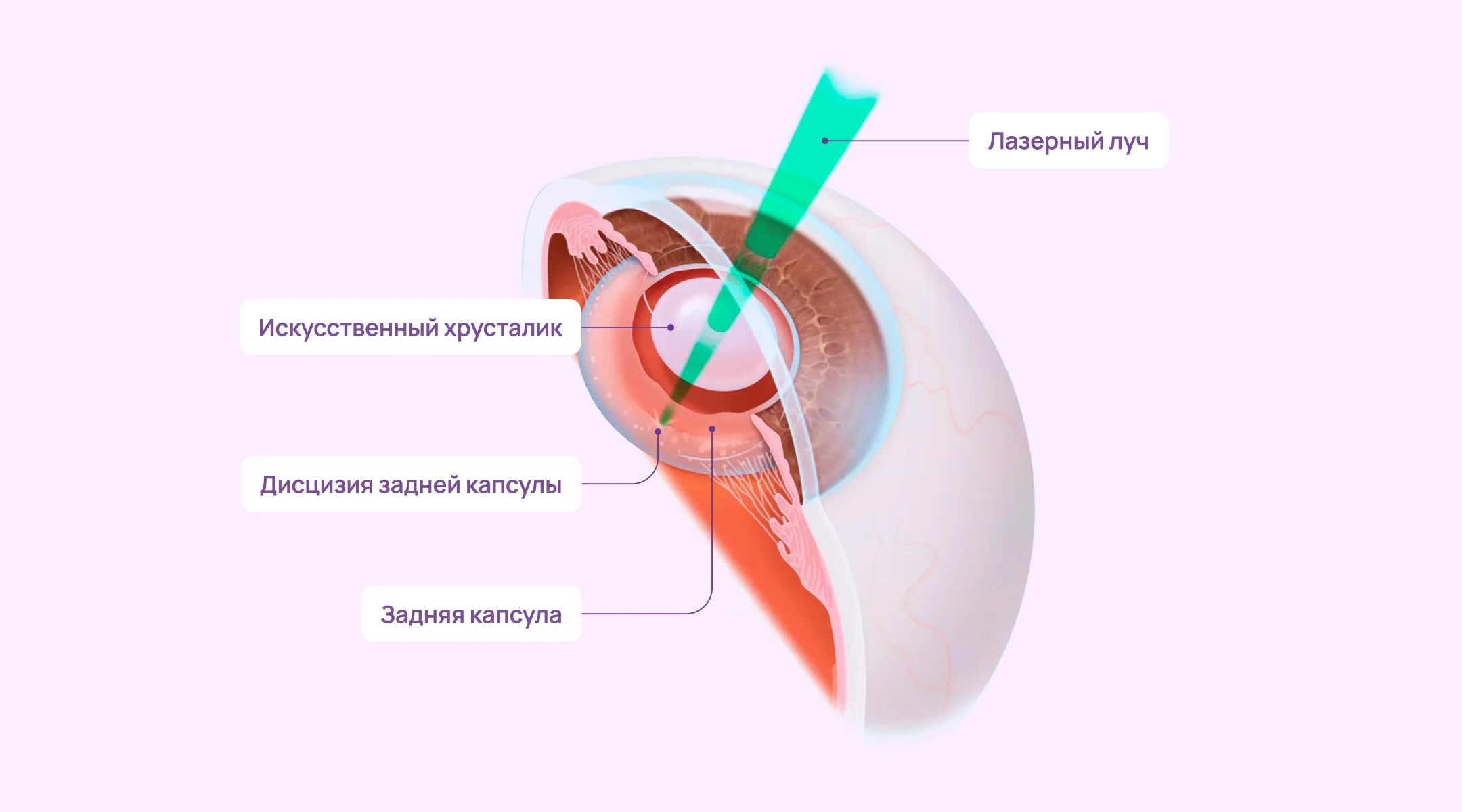 Для начала важно понять анатомию вопроса. Во время операции по удалению катаракты (факоэмульсификации) хирург удаляет помутневшее содержимое хрусталика, но сам «мешочек», в котором находился хрусталик (задняя капсула), не удаляется. Он остается на месте и служит надежным каркасом для имплантируемой интраокулярной линзы (ИОЛ).